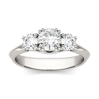 The Trio three-stone design is elegantly enhanced by a band that gently tapers. With three round cut stones, this classic ring that symbolizes the journey of past, present, and future.