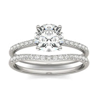 Embrace timeless elegance with this classic bridal set from our Signature Collection, featuring a round hearts & arrows embellished with shimmering accent stones, complemented by a meticulously crafted curved wedding band, and graced with matching accent stones.